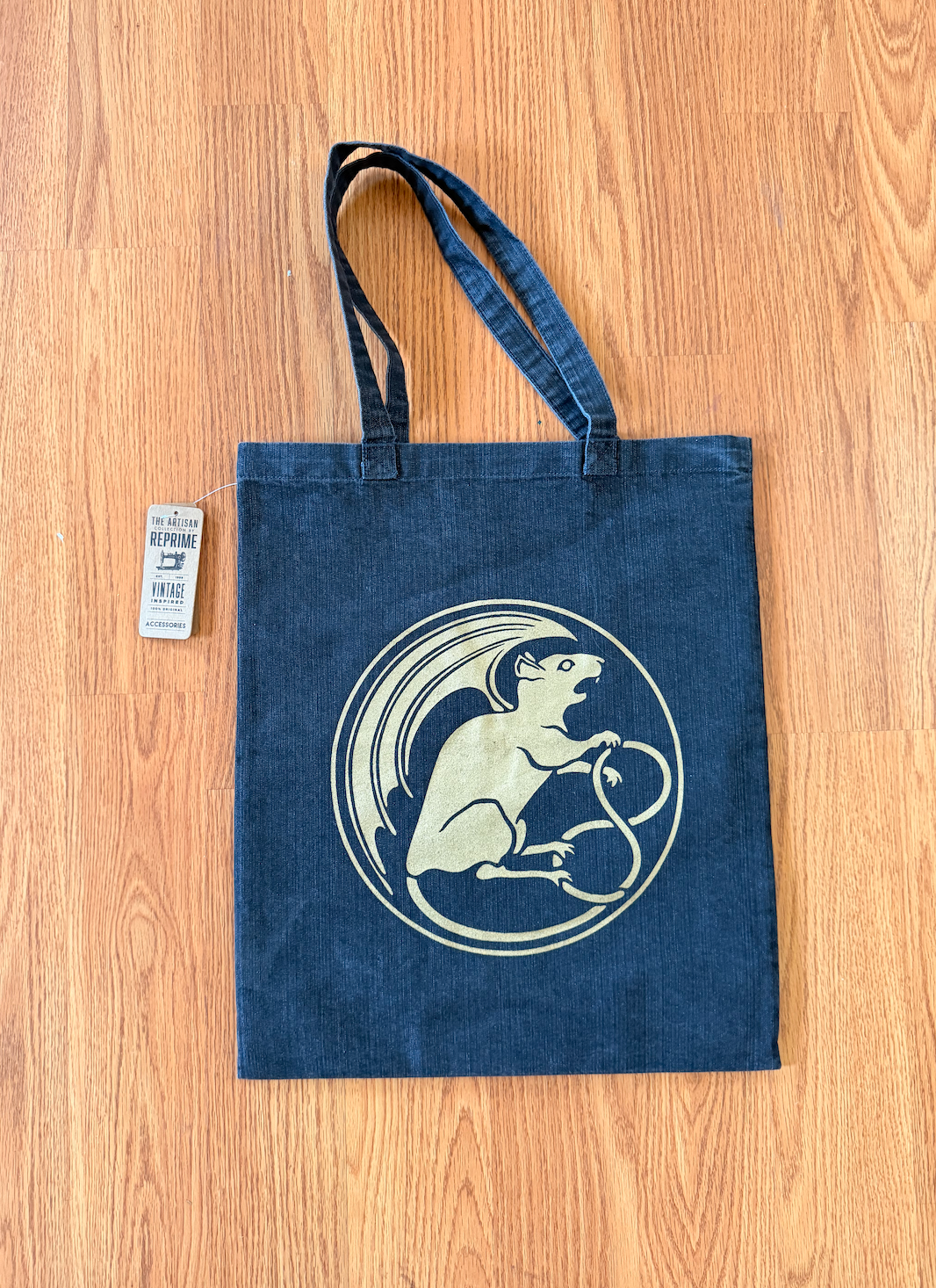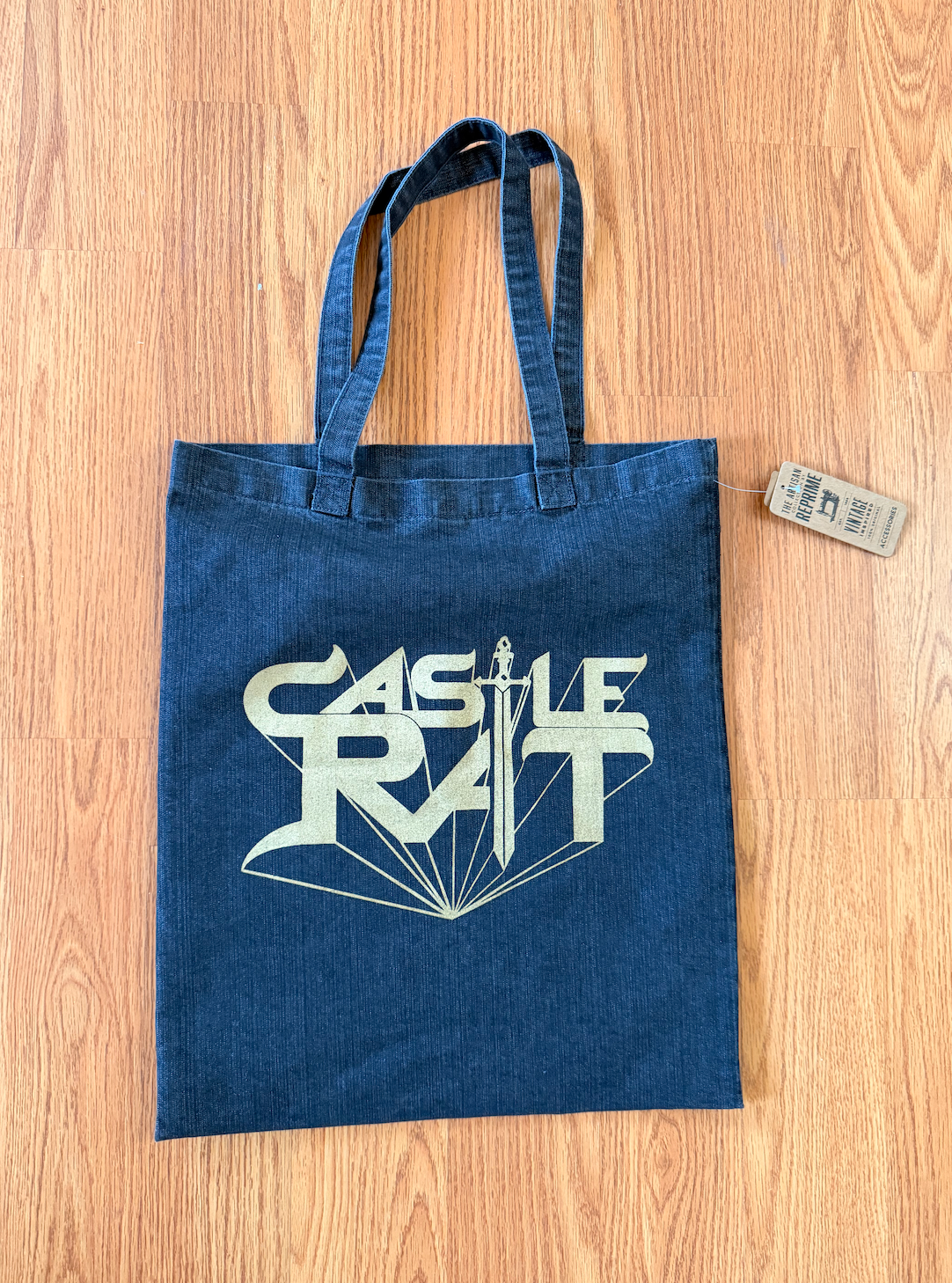 These durable black denim tote bags are printed on both sides in gold ink.