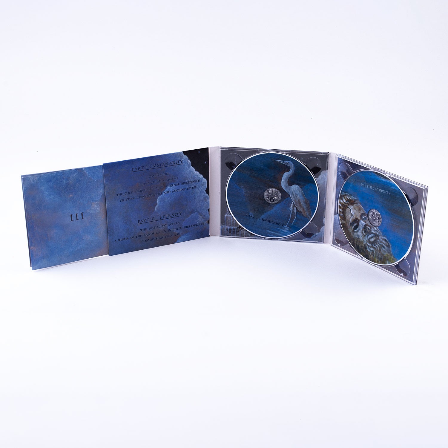 Divided into 2 parts – "Singularity" (tracks 1-4) and "Eternity" (tracks 5-7) – "III" come as a luxurious 6-panel double digipack with a 20-page full color booklet graced by a magnificent cover art courtesy of the renowned American symbolist painter Benjamin Vierling (Nightbringer, Weapon, Aosoth, Avichi, Watain).